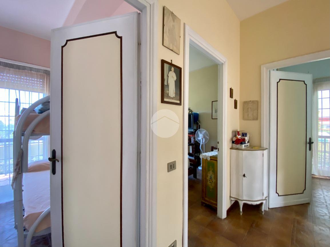 Mediante un’ampia scala in legno con corrimano si accede al piano superiore dedicato alla zona notte, composta da tre camere matrimoniali: due con balcone comunicante e una con balcone indipendente. Due camere dispongono di armadi a muro, oltre a un ulteriore armadio a muro presente nel disimpegno. Completa il piano un bagno con vasca e finestra.